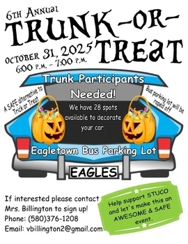 Eagletown STUCO's 6th Annual Trunk or Treat! If interested please contact Mrs. Billington. Phone: (580)376-1208 Email: vbillington2@gmail.com